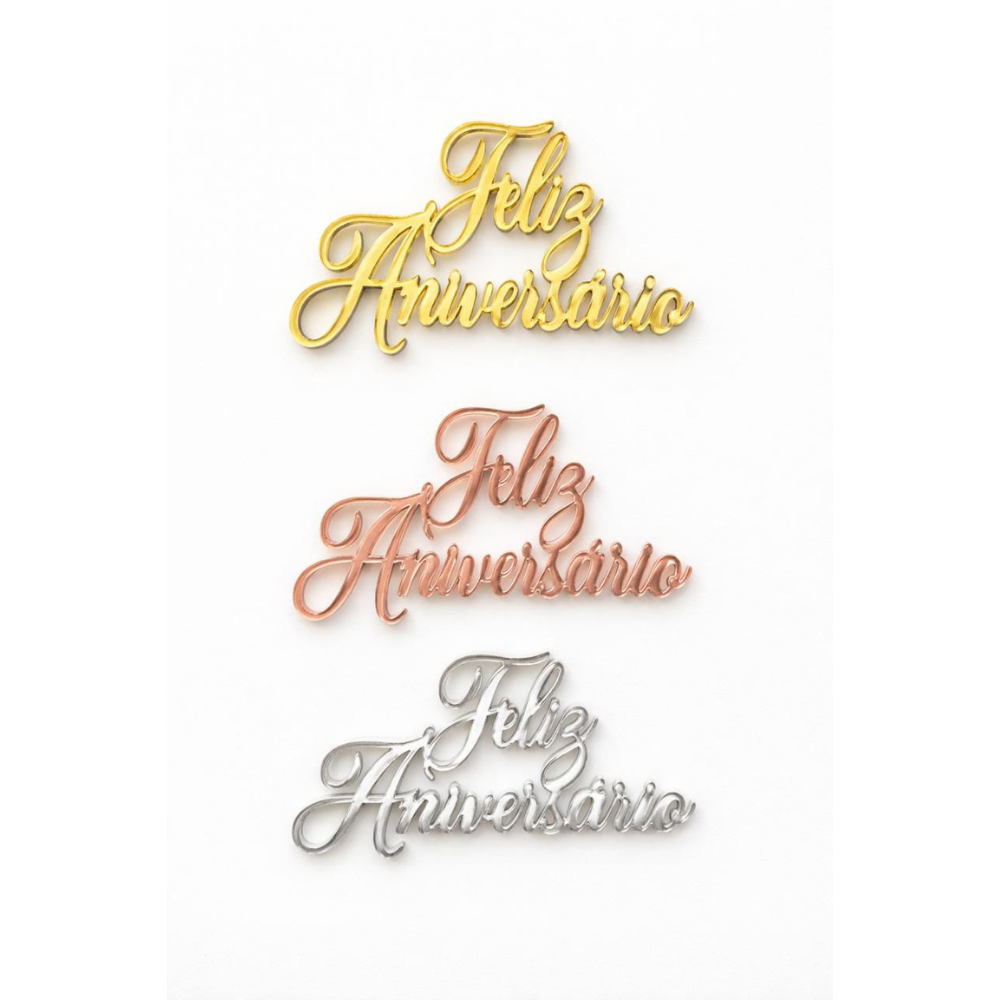 Aplique mini "Feliz Aniversário", em acrílico. Perfeito para decoração de bolos, possui 6,5cm.